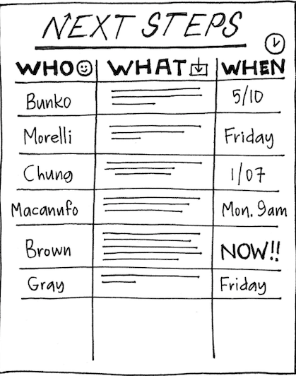 Muitas reuniões terminam com uma discussão sobre os “próximos passos” ou “itens de ação”. Essas discussões são frequentemente abstratas, começando com uma lista de tarefas que são entregues a participantes possivelmente relutantes, sem nenhum prazo específico anexado. Ao concentrar a discussão em uma matriz "Quem / O quê / Quando", você pode conectar as pessoas com ações nítidas sobre as tarefas e um compromisso sobre quando elas irão concluir a tarefa.