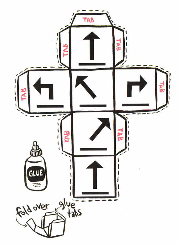 Dado de Direções, caneta marcadora, papel, fita adesiva ou cola.