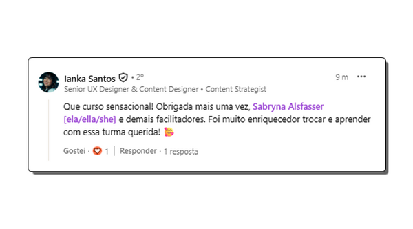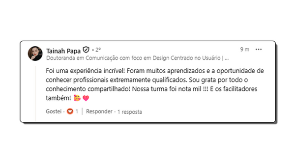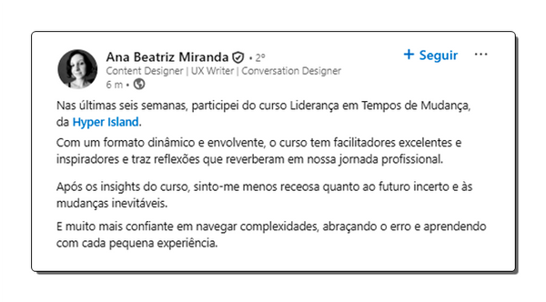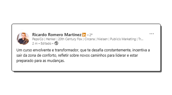 “Um curso online tão bom que nem parece curso online. As aulas valem cada segundo investido. Pela metodologia. Pelos convidados. Pelas trocas. Pelos colegas (Destaque para os colegas 🫂). Aqui a gente aprendeu (muito) compartilhando experiências. Sorte a minha por cair numa turma tão diferenciada. Sorte do mercado por ter essas pessoas que buscam ser líderes melhores. Indico tranquilamente”